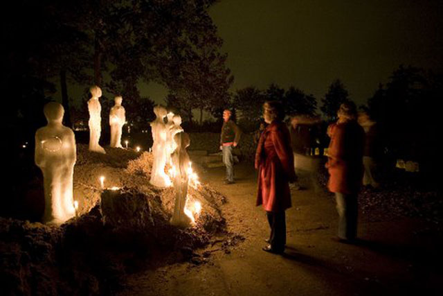 Allerzielen Alom provides the opportunity to remember the dead in a way which fits into modern society. It provides a new form for a tradition which was originally Catholic, but is not tied to any religion. Cemeteries are transformed into inviting places using light, flame, music, and art. Next of kin are given the opportunity to create a beautiful atmosphere at the grave. They can be assisted by artists and ritual counselors. Special places are designed which are open to all, since everyone has someone to remember. It doesn’t matter where the dead were buried or cremated.
